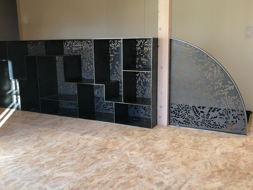 Fourniture et Découpe laser de tôles aluminium décoratives avec motif intégré, thermolaqué formant une bibliothèque permettant également une séparation de pièce.